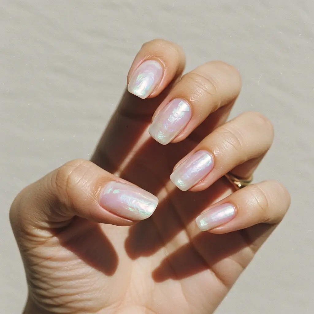 A sheer base with an iridescent, shell-like finish glows softly. This dreamy look is delicate and enchanting.