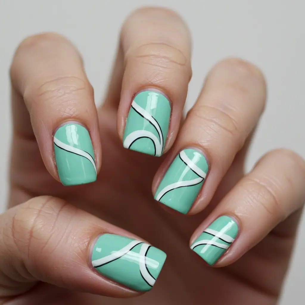 Apply mint green polish, then draw a white ribbon curling across each nail with a fine brush. It’s playful and fresh for a springtime vibe.