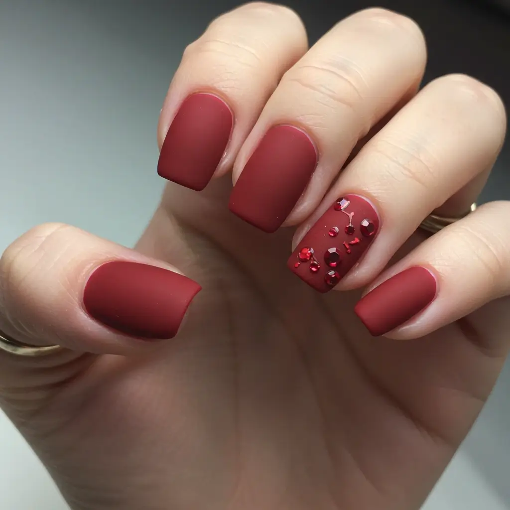 Matte red nails represent a blend of sophistication and subtlety that sets them apart from their glossy counterparts. The finish is not shiny or reflective, which allows the deep red color to shine through in a more muted and refined way. This understated elegance is appealing for those who prefer a look that is chic yet not overly flashy. Matte red nails can be seen as a statement of confidence, demonstrating that one does not need glitz and glamour to make an impression. The richness of the red hue, combined with the soft texture of the matte finish, creates a look that is both modern and timeless.